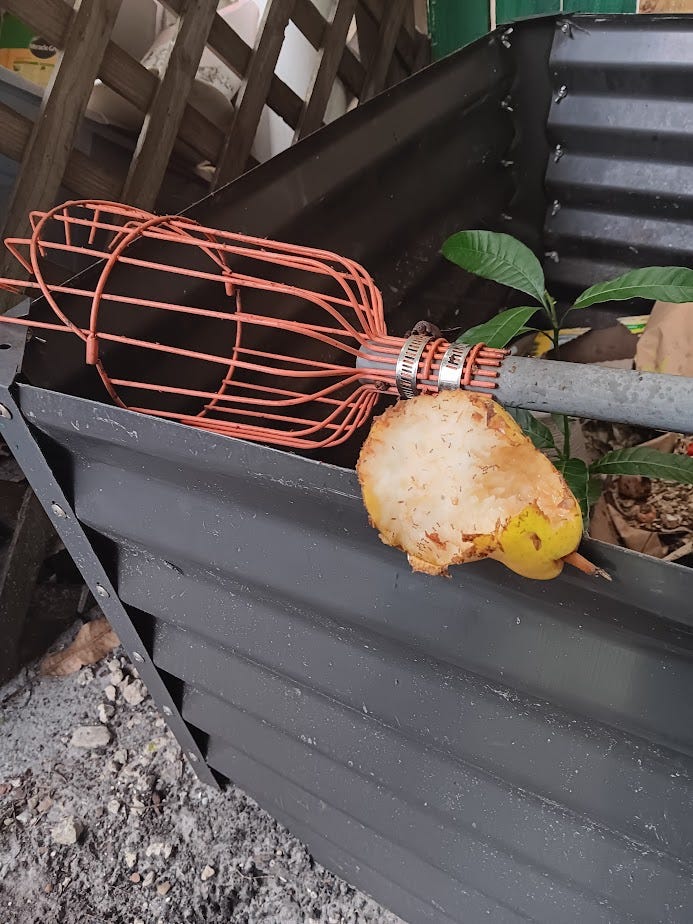 Well, my daughter came back outside and as I was sharing how I had been reprimanded, she noticed that the pear had not fallen into the garden compost bin. As you can see in the photograph, it landed on the side, securely skewered, as if someone caught it and sliced it to fit, tongue and groove on the metal wall of the bin. “Even the birds have Angels” my daughter said with a smile on her face. “We can’t make this stuff up” I said.